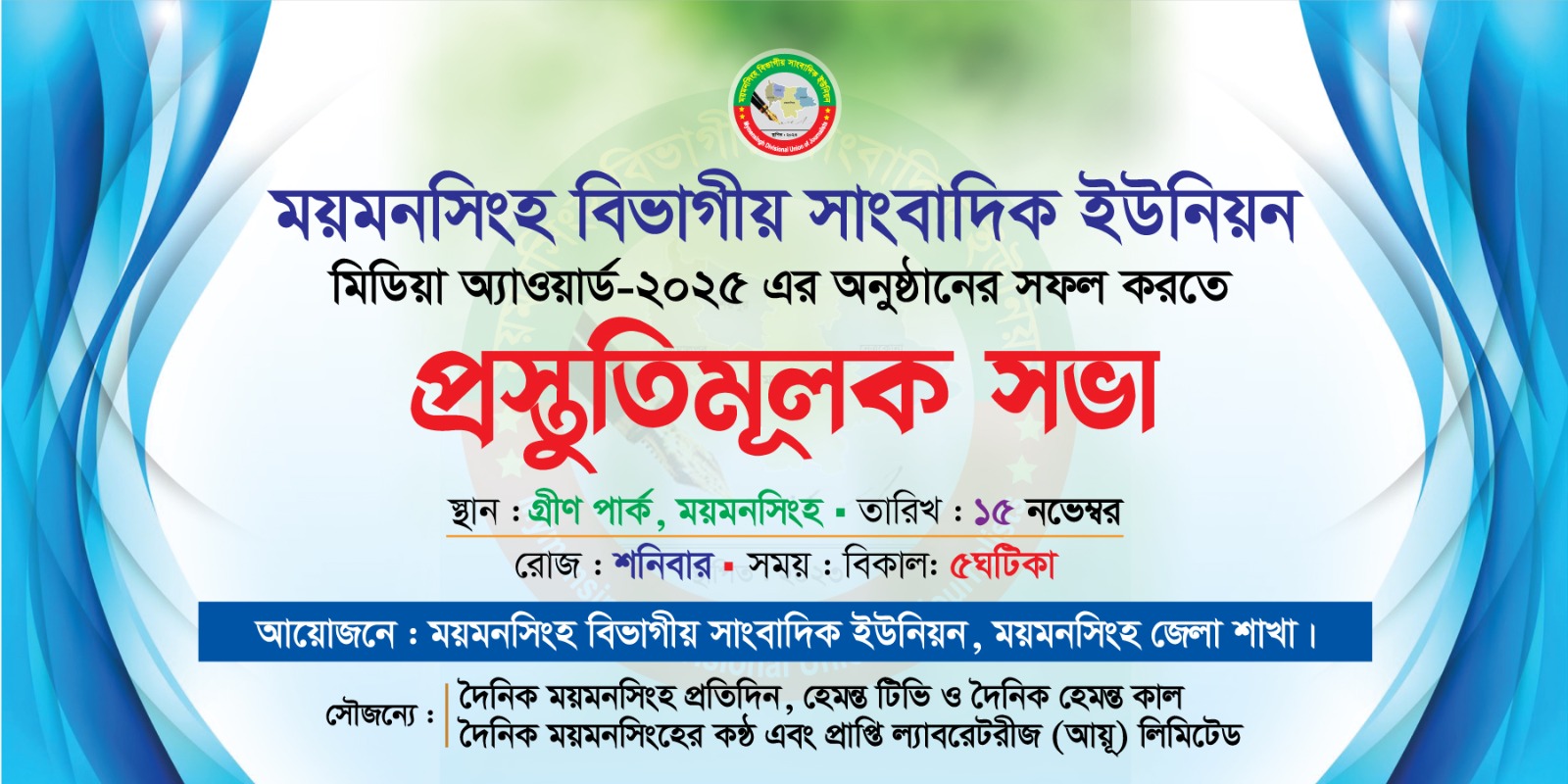 মিডিয়া অ্যাওয়ার্ড অনুষ্ঠান সফল করতে ময়মনসিংহে প্রস্তুতিমূলক সভা অনুষ্ঠিত হবে। ২০২৫ সালের ডিসেম্বর মাসের শেষের দিকে অনুষ্ঠিত হতে যাচ্ছে ময়মনসিংহ বিভাগীয় সাংবাদিক ইউনিয়নের উদ্যোগে “বিভাগীয় মিডিয়া অ্যাওয়ার্ড-২০২৫” অনুষ্ঠান। এই অনুষ্ঠানকে সফল ও সুষ্ঠুভাবে সম্পন্ন করার লক্ষ্যে আগামী ১৫ নভেম্বর ২০২৫ (শনিবার) এক প্রস্তুতিমূলক সভা অনুষ্ঠিত হবে।