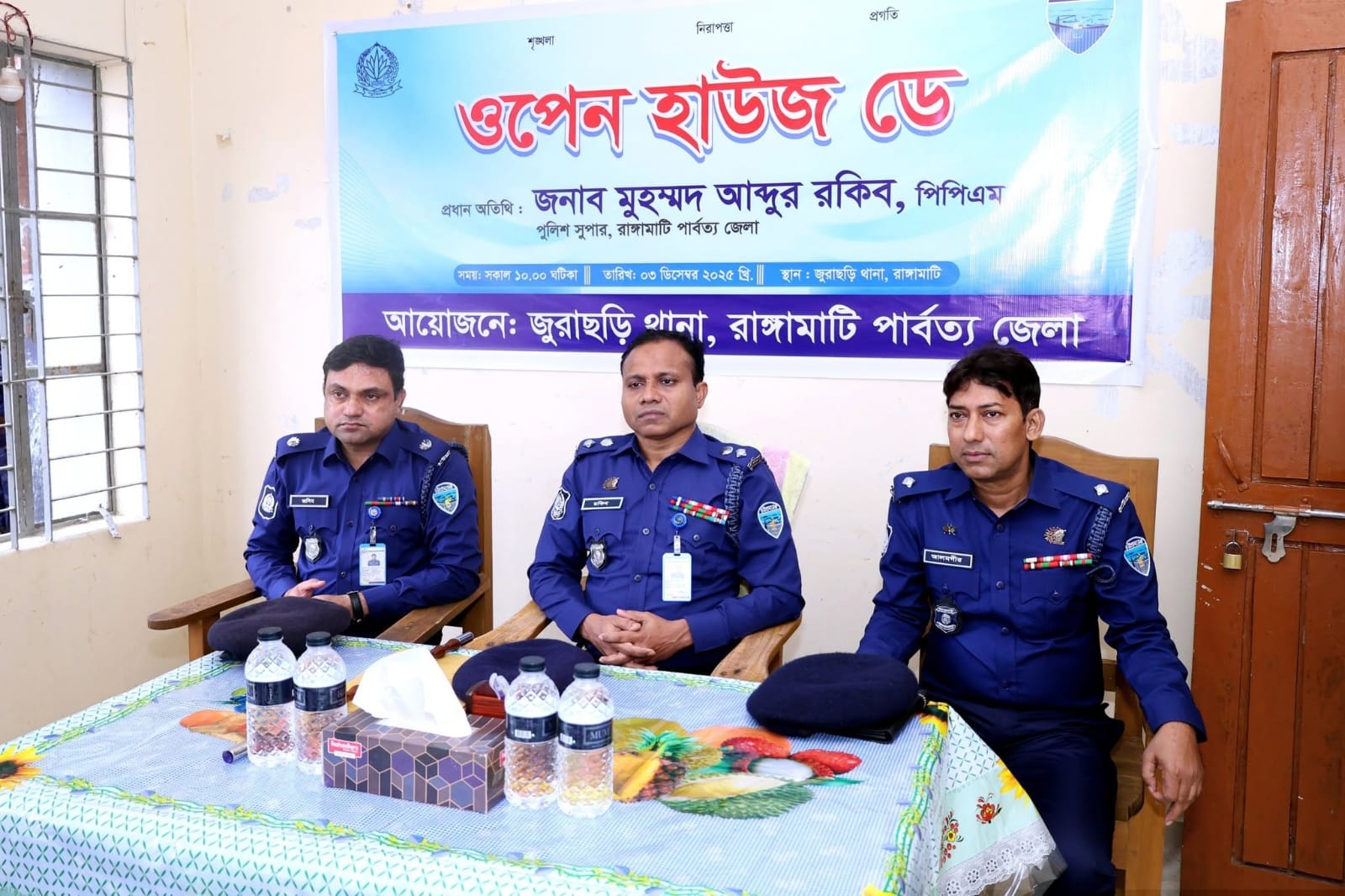 পরর্বতীতে পুলিশ সুপার জুরাছড়ি থানা পুলিশের আয়োজিত “ ওপেন হাউজ ডে ” – তে প্রধান অতিথি হিসেবে উপস্থিত থেকে জুরাছড়ি থানাধীন স্থানীয় জনপ্রতিনিধি, হেডম্যান-কারবারি, ব্যবসায়ীসহ বিভিন্ন শ্রেণি ও পেশার মানুষের সঙ্গে উন্মুক্ত মতবিনিময় করেন এবং তাদের বিভিন্ন সমস্যা ও প্রস্তাব মনোযোগসহকারে শুনে প্রয়োজনীয় দিকনির্দেশনা প্রদান করেন।