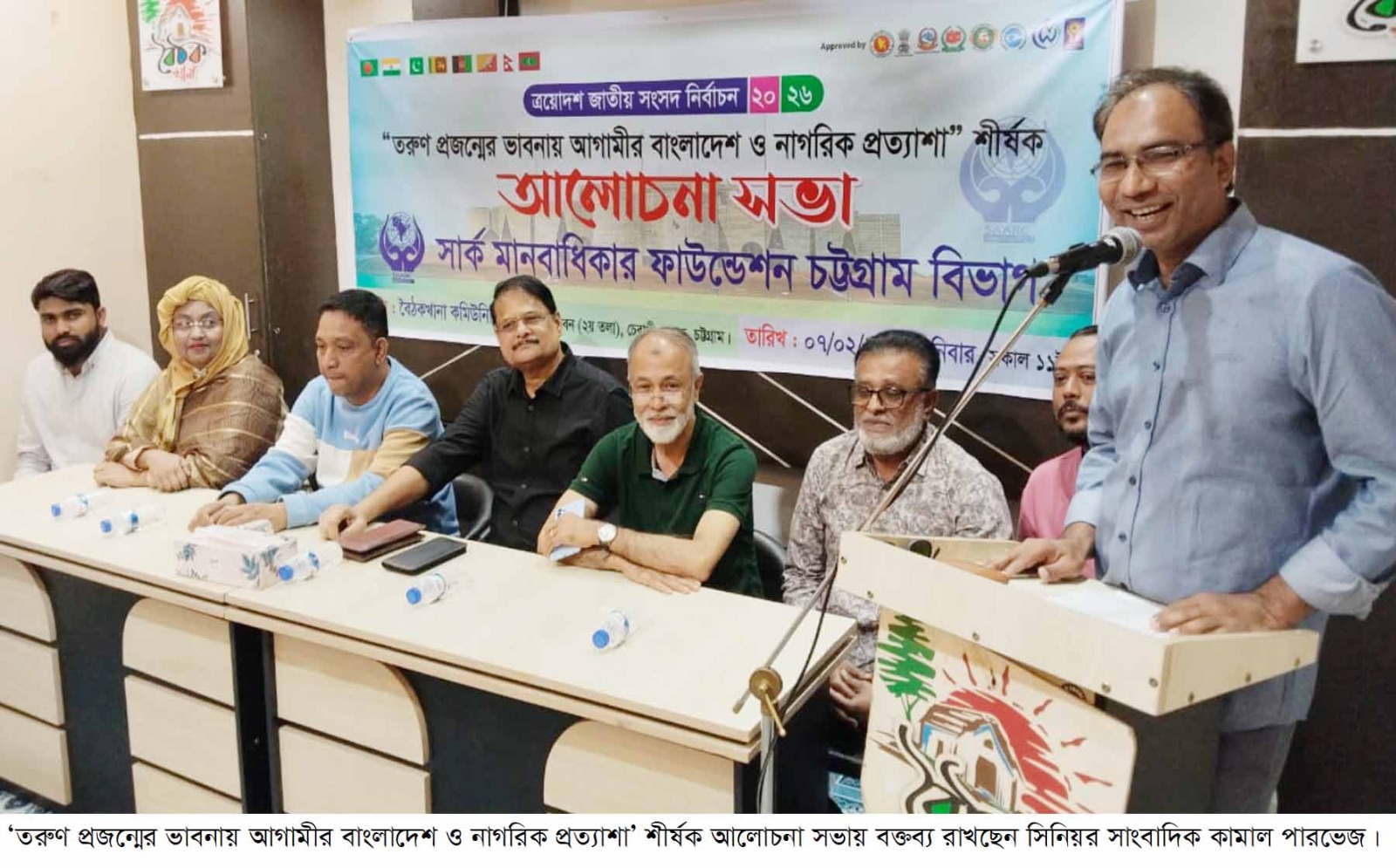 সার্ক মানবাধিকার ফাউন্ডেশন চট্টগ্রাম বিভাগের আয়োজনে ত্রয়োদশ সংসদ নির্বাচন ও গণভোট উপলক্ষে ‘তরুণ প্রজন্মের ভাবনায় আগামীর বাংলাদেশ ও নাগরিক প্রত্যাশা’ শীর্ষক আলোচনা সভা ৭ ফেব্রুয়ারি (শনিবার) সকাল ১১টায় নগরীর মোমিন রোড চেরাগী পাহাড়স্থ বৈঠকখানা কমিউনিট হলে অনুষ্ঠিত হয়। সংগঠনের যুগ্ম সম্পাদক আবছার উদ্দিন অলি’র পরিচালনায় এতে বক্তব্য রাখেন সংগঠনের সাধারণ সম্পাদক জাফর ইকবাল, সিনিয়র সাংবাদিক কামাল পারভেজ, প্রাবন্ধিক ও লেখক নেছার আহমেদ খান, অবসরপ্রাপ্ত সরকারি কর্মকর্তা ফেরদৌস খান, নারী নেত্রী সালমা বেগম, সাংবাদিক রোজি চৌধুরী, সংগীত শিল্পী মঞ্জুরুল আলম, সংগঠক মোঃ ইমরান, শিল্পী অচিন্ত্য কুমার দাশ, ফটো সাংবাদিক সমীরন পাল প্রমুখ। বক্তারা বলেন, তরুণরা এমন নেতৃত্ব চায়, যারা মাঠে ময়দানে সবসময় সক্রিয়, দুর্নীতিমুক্ত এবং দেশের জন্য নিবেদিত প্রাণ হয়ে কাজ করে যাবে। কর্মসংস্থান ও অর্থনৈতিক উন্নয়ন, বেকারত্ব হ্রাস, প্রযুক্তিভিত্তিক শিক্ষা এবং স্টার্টআপ ইকোসিস্টেম গড়ে তোলার মাধ্যমে স্বনির্ভর বাংলাদেশ গড়ার স্বপ্ন, সুশাসন ও বাকস্বাধীনতা, মত প্রকাশের স্বাধীনতা, আইনের শাসন এবং ন্যায়বিচার নিশ্চিতকরণ করবে আগামী নির্বাচনে নেতৃত্ব দানকারী তরুণরা। সেই সাথে স্মার্ট বাংলাদেশ, ডিজিটাল প্রযুক্তির সর্বোচ্চ ব্যবহার নিশ্চিত করে বৈষম্যহীন সমাজ প্রতিষ্ঠা করায় হবে নতুন সরকারের প্রথম চ্যালেঞ্জ। বক্তারা আরো বলেন, মোট জনসংখ্যার একটি বড় অংশ ৩৫ বছরের নিচে। এই তরুণ জনগোষ্ঠী শুধু ভোটের হিসাব নয়, তারা দেশের উৎপাদনশীল শক্তি, শ্রমবাজার এবং ভবিষ্যৎ নেতৃত্বের ভিত্তি। আলোচনা সভায় বিভিন্ন কলেজ ও বিশ্ববিদ্যালয়ের শিক্ষার্থীরা অংশগ্রহণ করেন।